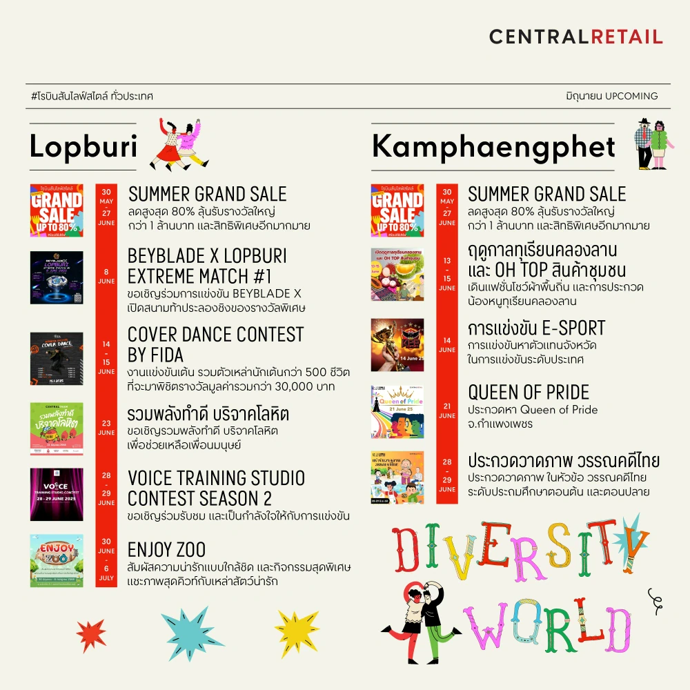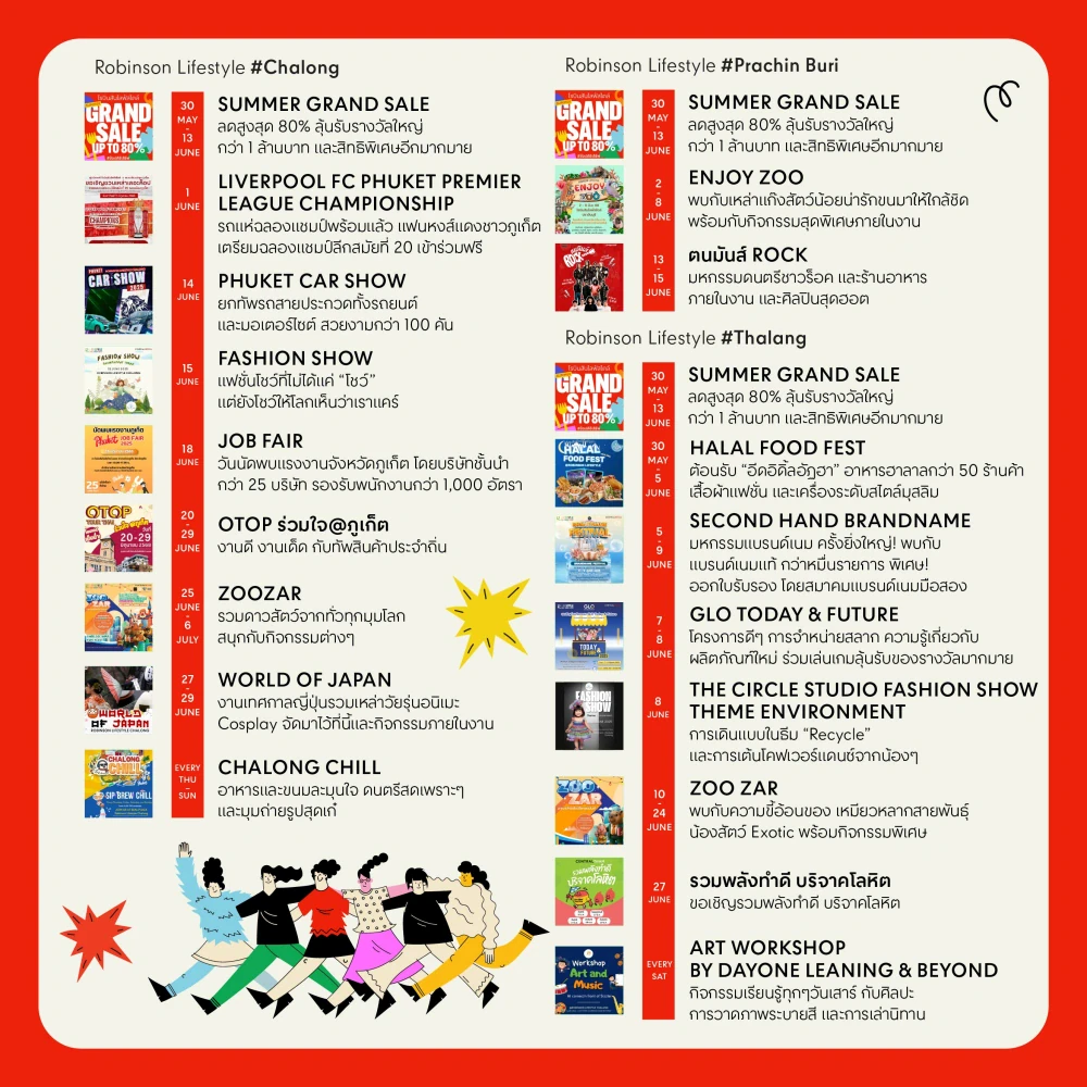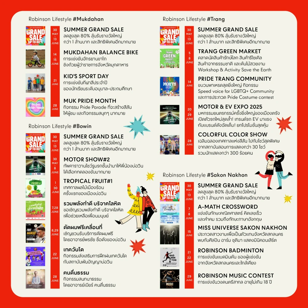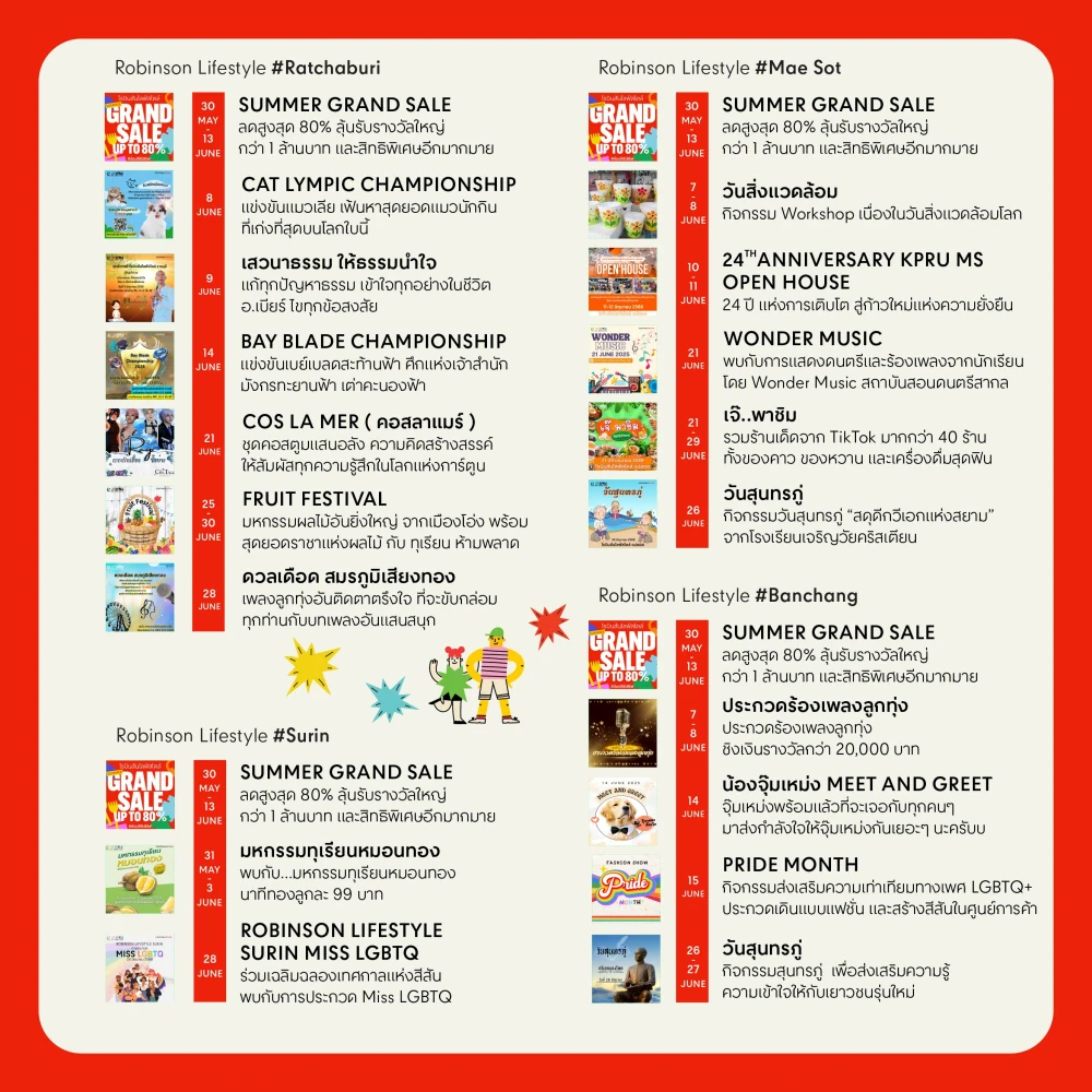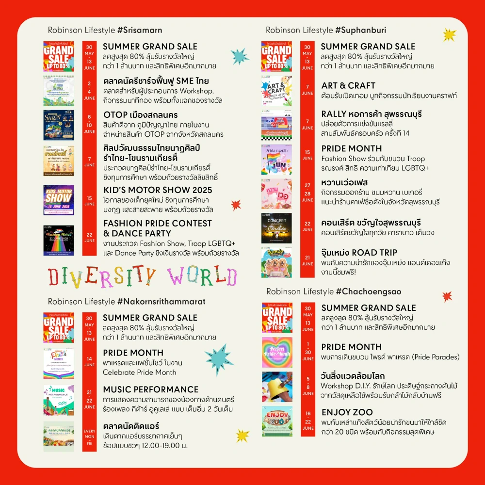 ศูนย์การค้าโรบินสันไลฟ์สไตล์ ในเครือเซ็นทรัล รีเทล พร้อมเสิร์ฟความสุข ทุกความหลากหลาย กับกิจกรรมอิเวนต์ตอบโจทย์ทุกไลฟ์สไตล์ตลอดเดือนมิถุนายนนี้ พลาดไม่ได้! กับกิจกรรมหลากหลายที่ตอบโจทย์ทุกเจเนอเรชัน ไม่ว่าจะเป็นการประกวดความสามารถเด็กและเยาวชน การแข่งขันกีฬา การแสดงจากกลุ่มศิลปินท้องถิ่น กิจกรรมสัตว์เลี้ยงสุดน่ารัก พร้อมแคมเปญ “Robinson Lifestyle Summer Grand Sale 2025” ระหว่างวันที่ 30 พ.ค. 68 - 13 ก.ค. 68 ซึ่งถือเป็นหนึ่งในงานเซลครั้งยิ่งใหญ่แห่งปี ที่มอบส่วนลดสูงสุดถึง 80% เพื่อร่วมขับเคลื่อนเศรษฐกิจ ปลุกพลังค้าปลีก และกระตุ้นการจับจ่ายกลางปี เปิดโอกาสให้คนไทยทั่วประเทศได้เข้าถึงสินค้าคุณภาพดีในราคาสุดคุ้ม