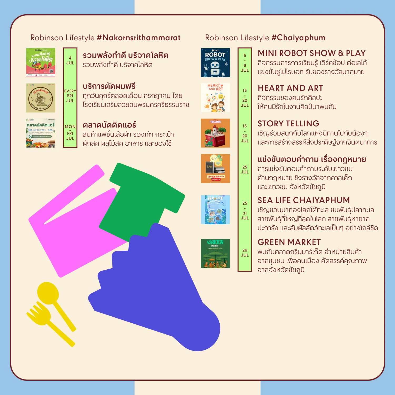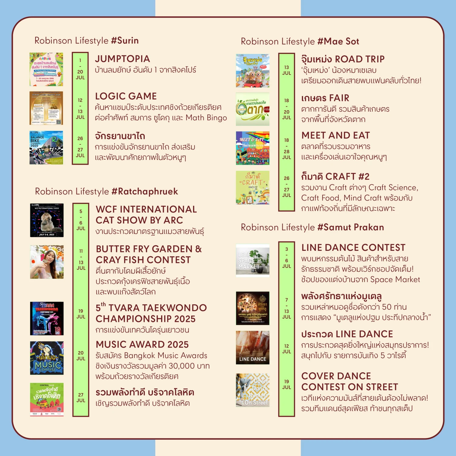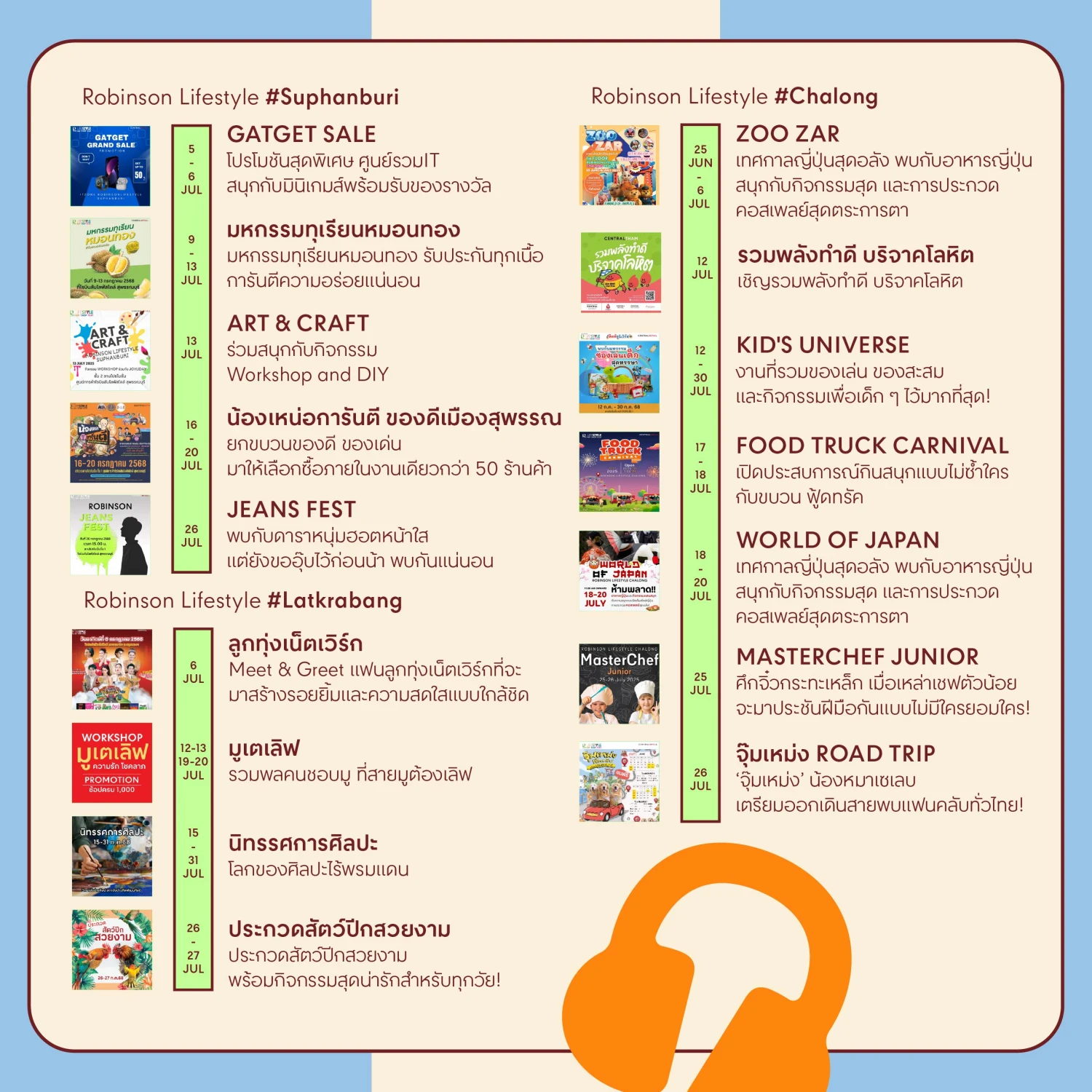 มาร่วมเติมพลังความสุขไปกับมากกว่า 100 อิเวนต์ตอบโจทย์ทุกไลฟ์สไตล์ สำหรับทุกวันได้ที่ศูนย์การค้าโรบินสันไลฟ์สไตล์ ทุกสาขาทั่วประเทศ ได้แก่