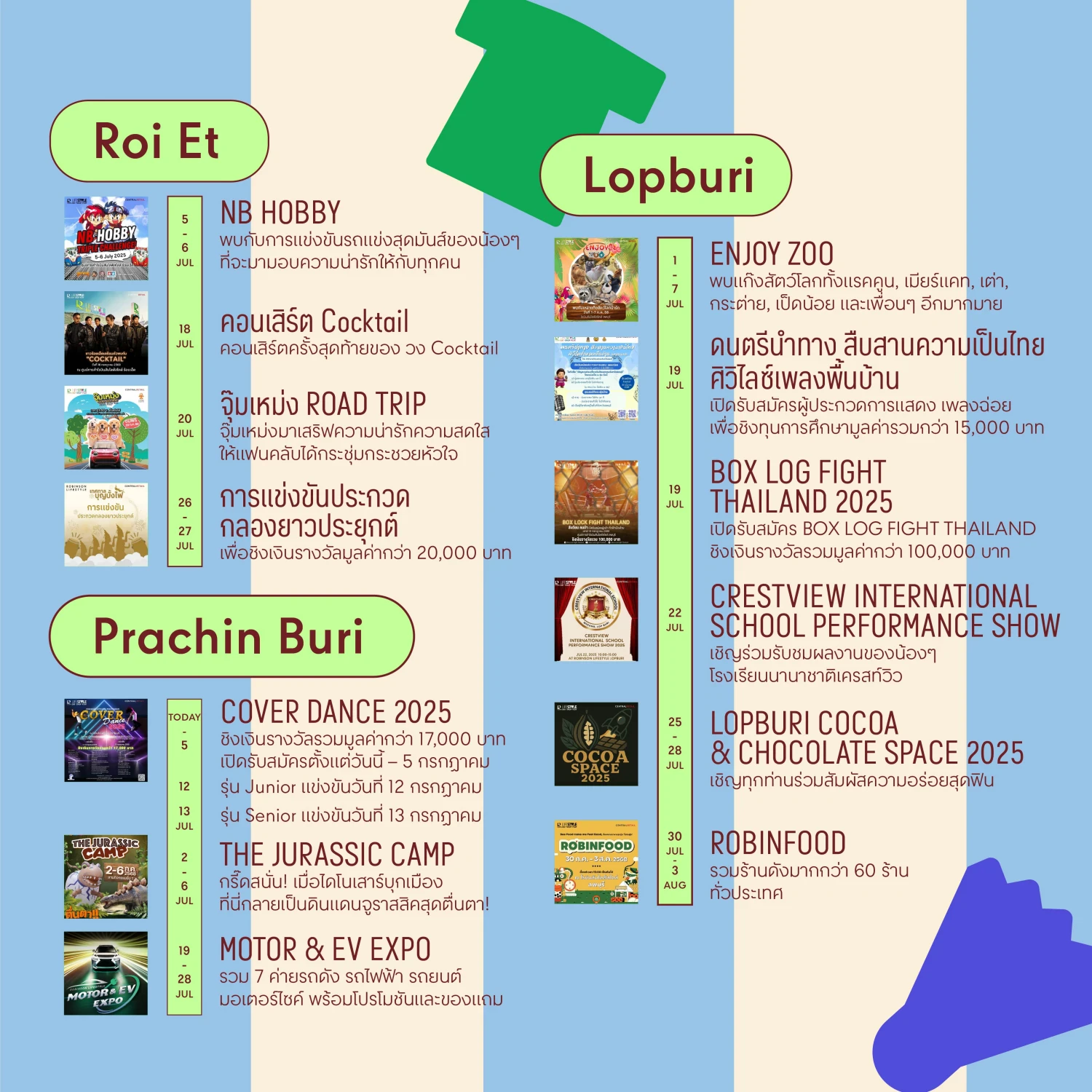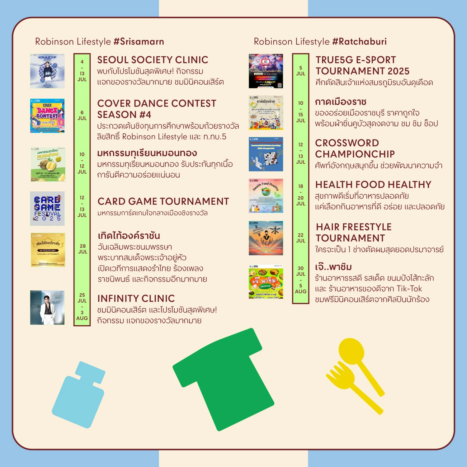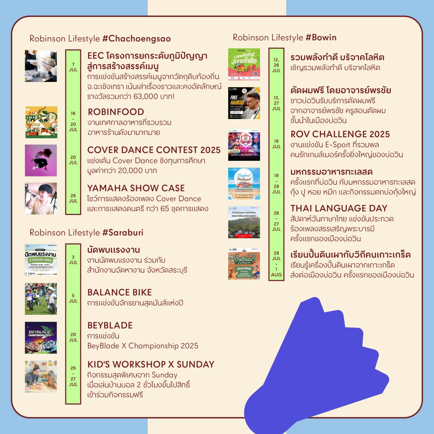 มาร่วมเติมพลังความสุขไปกับมากกว่า 100 อิเวนต์ตอบโจทย์ทุกไลฟ์สไตล์ สำหรับทุกวันได้ที่ศูนย์การค้าโรบินสันไลฟ์สไตล์ ทุกสาขาทั่วประเทศ ได้แก่