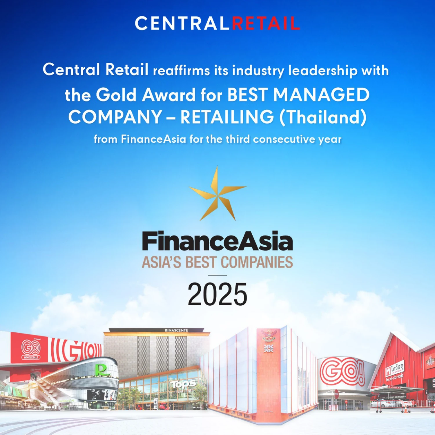 Central Retail reinforces its leadership in Thailand’s retail and wholesale industry with a third consecutive win of the Gold Award for Best Managed Company – Retailing (Thailand) from FinanceAsia, underscoring its excellence on a regional scale