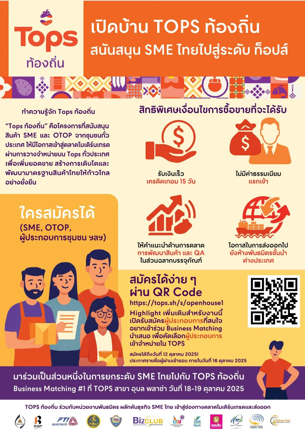 Join the journey towards partnership with TOPS at the “TOPS Tongtin Open House”, taking place at TOPS, Ubon Plaza Branch, in Ubon Ratchathani Province on 18-19 October 2025. More details are available on Facebook ‘TOPS ท้องถิ่น TOPS Tongtin’ page.
