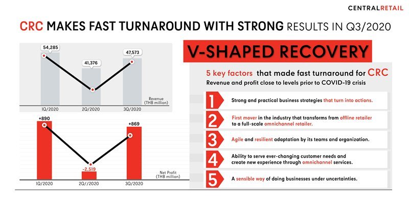 Bangkok, 13 November 2020 – Central Retail Corporation Public Company Limited (CRC) has achieved the V-shaped recovery of its operating results in the third quarter of 2020 which was close to its performance prior to the COVID-19 crisis (first quarter of the same year). The company attributes the quick turnaround to 5 key factors. They are: