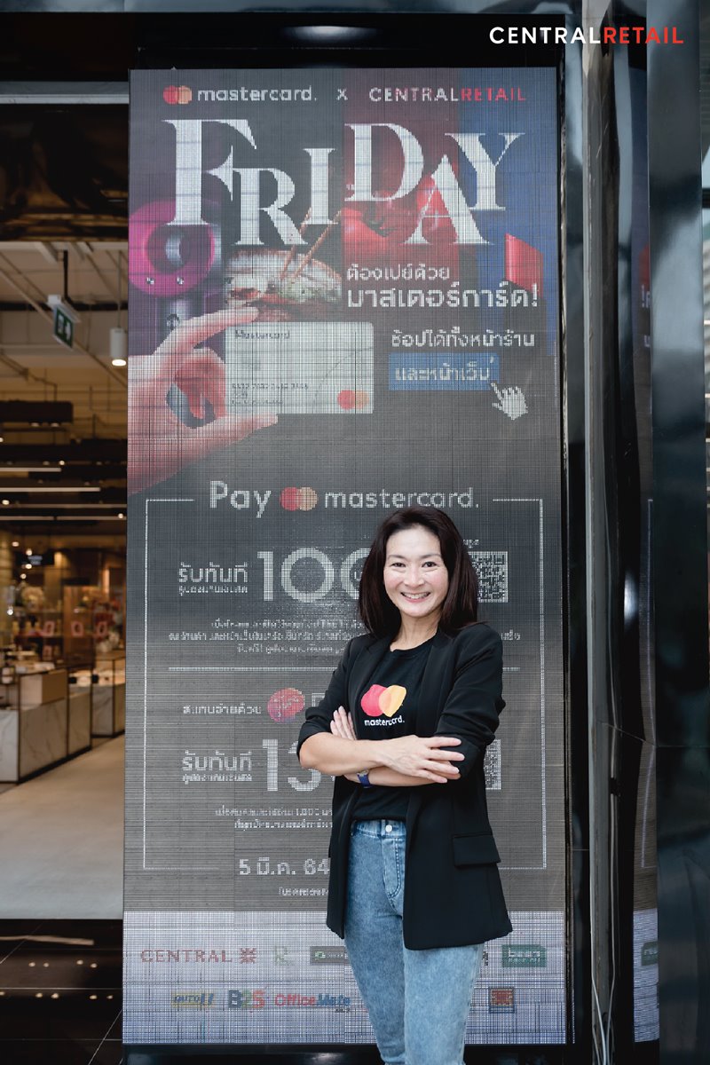 Spend via Mastercard card from THB 1,000/receipt, both in-store and online, receive a cash coupon worth THB 100 on The 1 application. Special for in-store, pay via Dolfin Wallet application with a Mastercard card, receive a cash coupon worth THB 130 on Dolfin Wallet application for the next purchase of over 1,000,000 products at over 1,000 participating stores under Central Retail which are Central Department Store, Robinson, Supersports, Power Buy, CMG, Thai Watsadu, Baan and Beyond, Auto1, B2S, OfficeMate, Central Food Hall, Tops Supermarket, Family Mart, and Matsumoto Kiyoshi. Central Retail is confident that this campaign will drive at least 40% more traffic to our stores every Friday.”
