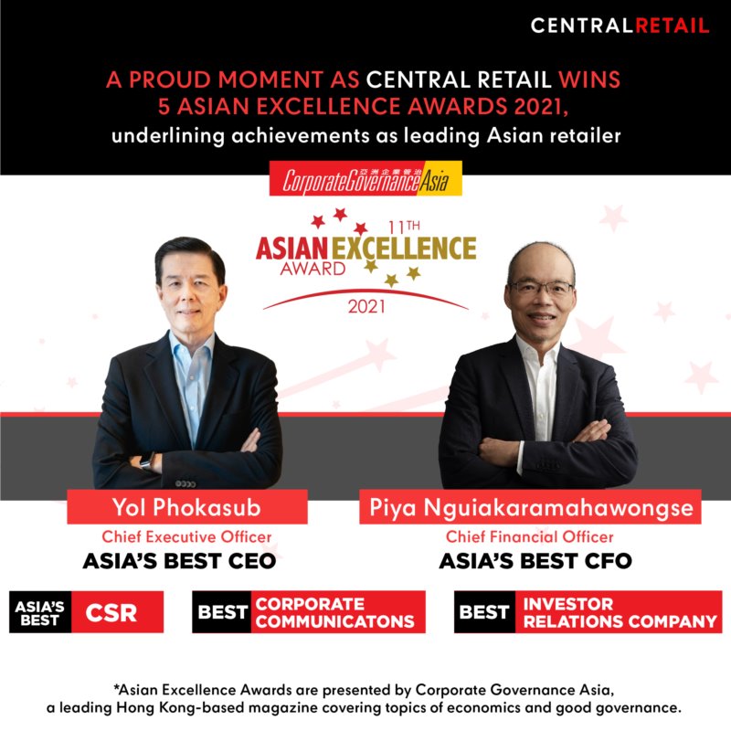 Bangkok: November 23, 2021 - Central Retail Corporation Public Company Limited achieved 5 Asian Excellence Awards 2021, reflecting leadership in retail and excellent international-level corporate governance. The 5 awards are Asia’s Best CEO, awarded to Mr. Yol Phokasub; Asia’s Best CFO, awarded to Mr. Piya Nguiakaramahawongse; Asia’s Best CSR; Best Investor Relations Company and Best Corporate Communications Team.