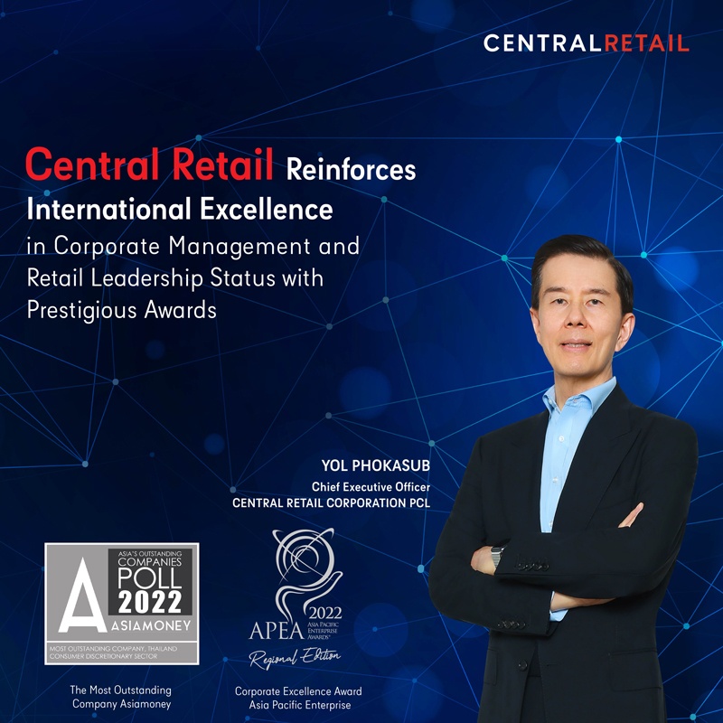 Bangkok: October 21st, 2022 - Central Retail Corporation PCL (CRC) solidifies its positioning as a retail leader of the future by winning two major global awards of business excellence; being voted #1 in Asia’s Outstanding Companies Poll 2022, organized by Asiamoney, in the group of The Most Outstanding Company in Consumer Discretionary category, for the second consecutive year, and winning the Corporate Excellence Award from Asia Pacific Enterprise Awards 2022 (APEA) Regional Edition. These awards illustrate the potential of strong and efficient management and solid performance, recognized by leading international institutions.
