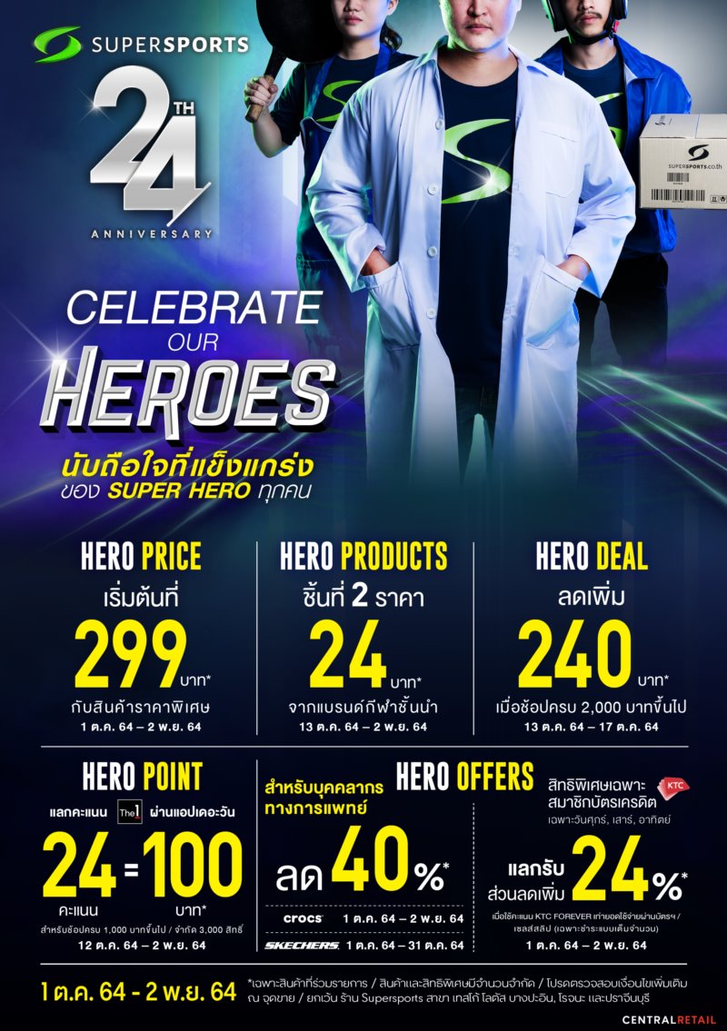 Bangkok – 8 October 2021 – Supersports, Thailand's No. 1 sporting goods store under Central Retail, is celebrating its 24th anniversary with the Celebrate Our Heroes campaign to express gratitude to all of those who have been unyielding in the fight against COVID-19. The company will be offering big promotions to drive sales through in-store and online channels responding to the new normal lifestyle and building on its omni-channel strategy that provides a consumer-centered and seamless shopping platform.