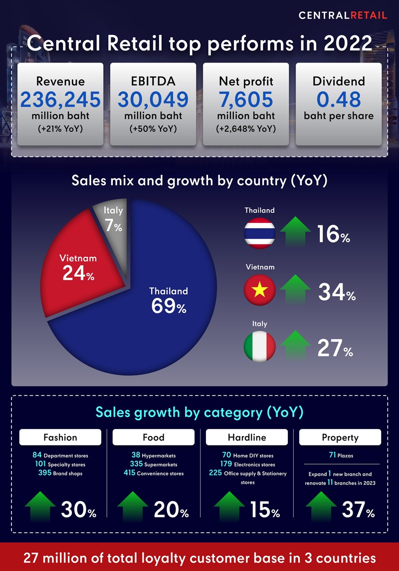 Central Retail top performs in 2022, sweeping a revenue of THB 236,245 million or 21% growth with a net profit of THB 7,605 million or 2,648% growth, and announces dividend of 0.48 Baht per share