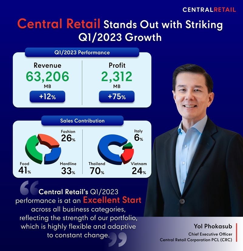 Bangkok, 15 May 2023 - Mr. Yol Phokasub, Chief Executive Officer of Central Retail Corporation or CRC stated, “As for Central Retail’s overall performance, the company has achieved an excellent start across all business categories, with revenue and profit exceeding pre-Covid-19 crisis. Central Retail’s Q1 performance shows a total revenue of THB 63,206 million (+12% YoY) EBITDA THB 8,179 million (+24% YoY) with a net profit of THB 2,312 million (+75% YoY). The company achieved a 30% sales growth in the fashion category, 9% growth in the food category. Sales in the hardline category in the Thai market also continue to grow at 9% despite the downward trend in the industry. These results are positive signals, which are indicative of Central Retail’s further growth prospect in 2023, reaching its growth targets and driving up revenue by 12-15%.”