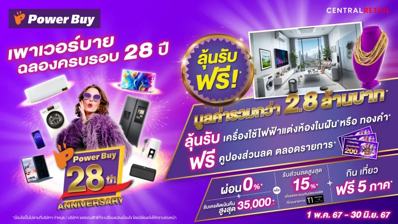 ทั้งนี้ ในโอกาสครบรอบ 28 ปี เพาเวอร์บาย ได้จัดโปรโมชั่นพิเศษ...ลุ้นรับของรางวัลกว่า 2.8 ล้านบาท ได้แก่ เซ็ตเครื่องใช้ไฟฟ้าตกแต่งห้องในฝันจากซัมซุง, ทีซีแอล, แอลจี, ฮิตาชิ และอีเลคโทรลักซ์ ทองคำรวมมูลค่า 400,000 บาท คูปองส่วนลดทันที, ผ่อน 0% นานสูงสุด 36 เดือน หรือรับเครดิตเงินคืนสูงสุด 35,000 บาท เฉพาะบัตรเครดิตที่ร่วมรายการ, พิเศษ! ช้อปผ่านบัตรเครดิตเซ็นทรัล เดอะวัน รับสิทธิ์ลุ้นรับห้องในฝ้น หรือทองคำเพิ่มอีก 10 สิทธิ์ แลกคะแนนรับส่วนลดเพิ่มสูงสุด 15% พบความคุ้มค่าได้ที่ เพาเวอร์บายทุกสาขา ทั่วประเทศ เว็บไซต์ www.powerbuy.co.th แอป http://bit.ly/PowerBuyApp และโซเชียลมีเดีย ตั้งแต่วันที่ 1 พ.ค. - 30 มิ.ย. 67