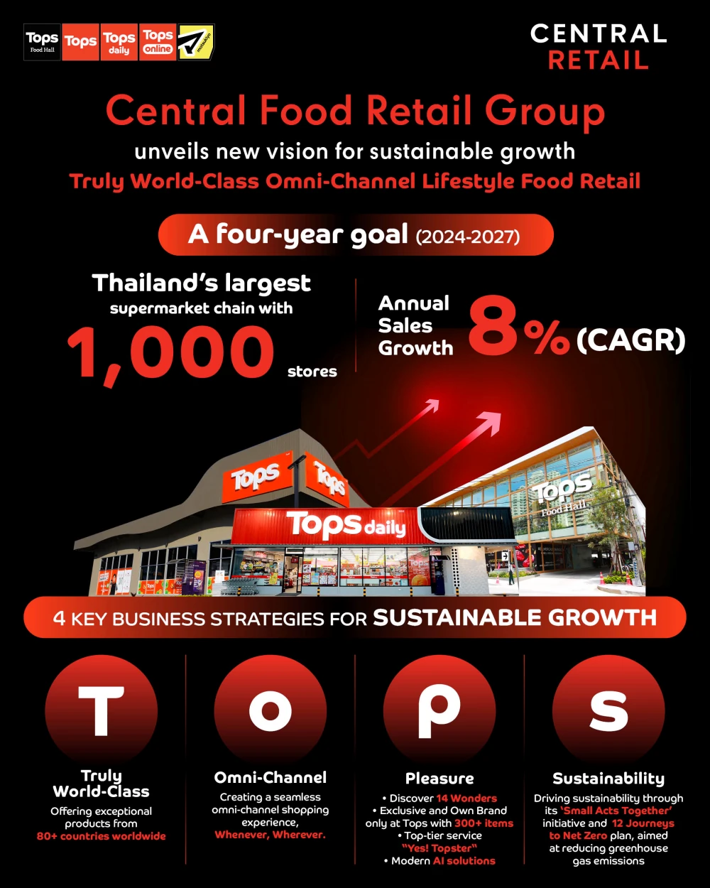 Central Food Retail Group marks 28 years of ‘Tops’ with a bold new vision as a ‘Truly World-Class Omni-Channel Lifestyle Food Retail’, targeting to achieve 1,000 stores by 2027, solidifying its position as Thailand's largest supermarket chain