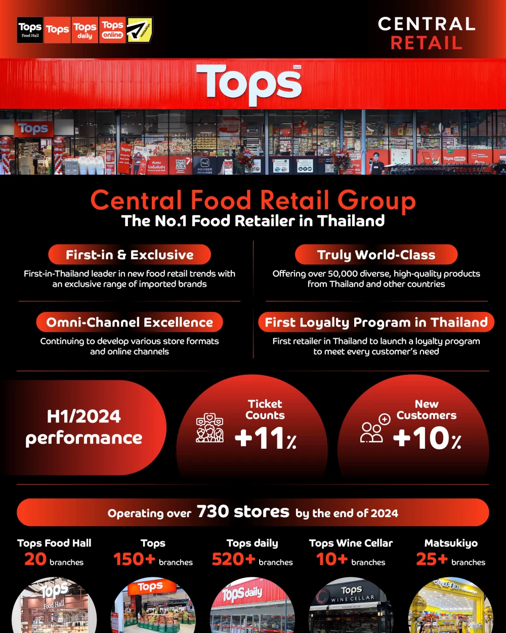 Bangkok, 19 August 2024 - Central Food Retail Company Limited, a subsidiary of Central Retail and operator of the Tops, Tops Food Hall, Tops daily, Tops Online and Matsukiyo brands, celebrates 28 years of success as a leader in Thailand's food retail industry. Reinforcing its position as the top food retail brand in the country, the company reports its half-year 2024 performance with a 11% increase in ticket counts and a 10% rise in new customers compared to the previous year. Central Food Retail Group is driving stable business growth with a 1.6 billion baht investment budget for 2024, powered by the T-O-P-S strategy under its new vision, ‘Truly World-Class Omni-Channel Lifestyle Food Retail’ aiming to achieve a total of 1,000 stores by 2027.