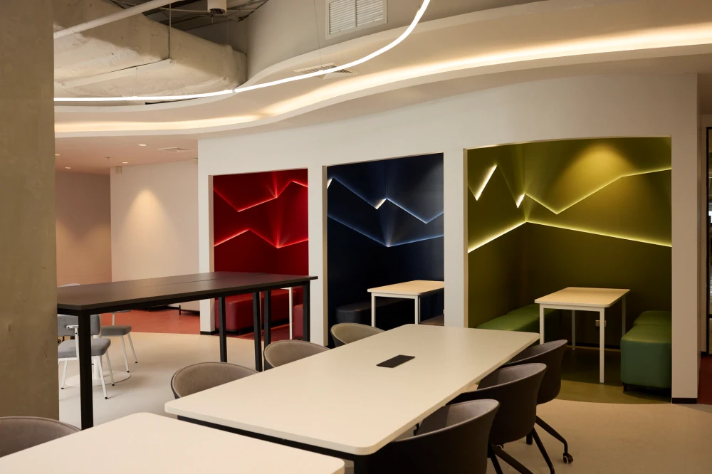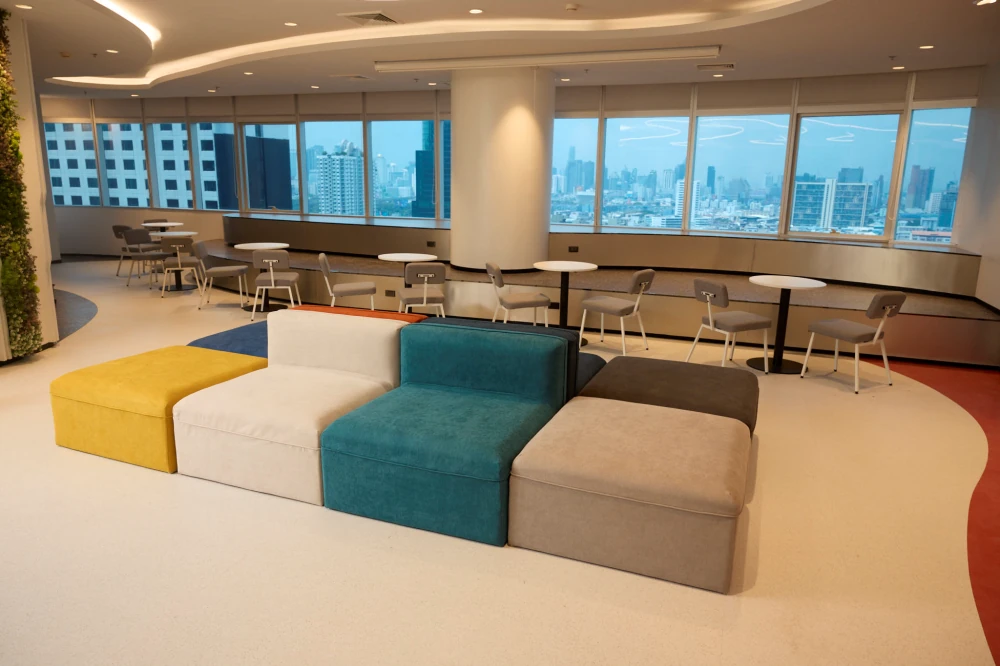 Townhall & Mobile Working Space มีพื้นที่ทำงานที่หลากหลายอำนวยความสะดวกให้พนักงานนั่งทำงานร่วมกันได้มากขึ้น พร้อมแชร์ความคิด ต่อยอดการทำงาน เพื่อผลลัพธ์การทำงานที่ดีขึ้น