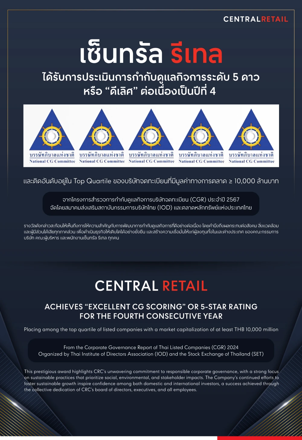 บริษัท เซ็นทรัล รีเทล คอร์ปอเรชั่น จำกัด (มหาชน) มุ่งมั่นในการกำกับดูแลกิจการที่ดี โดยได้รับการประเมินการกำกับดูแลกิจการในระดับ “ดีเลิศ” หรือ 5 ตราสัญลักษณ์ ต่อเนื่องเป็นปีที่ 4 และติดอันดับอยู่ใน Top Quartile ของบริษัทจดทะเบียนที่มีมูลค่าหลักทรัพย์ตามราคาตลาด (Market Capitalization) ไม่น้อยกว่า 10,000 ล้านบาท จากโครงการ CGR ประจำปี 2567 จัดโดยสมาคมส่งเสริมสถาบันกรรมการบริษัทไทย (IOD) และตลาดหลักทรัพย์แห่งประเทศไทย