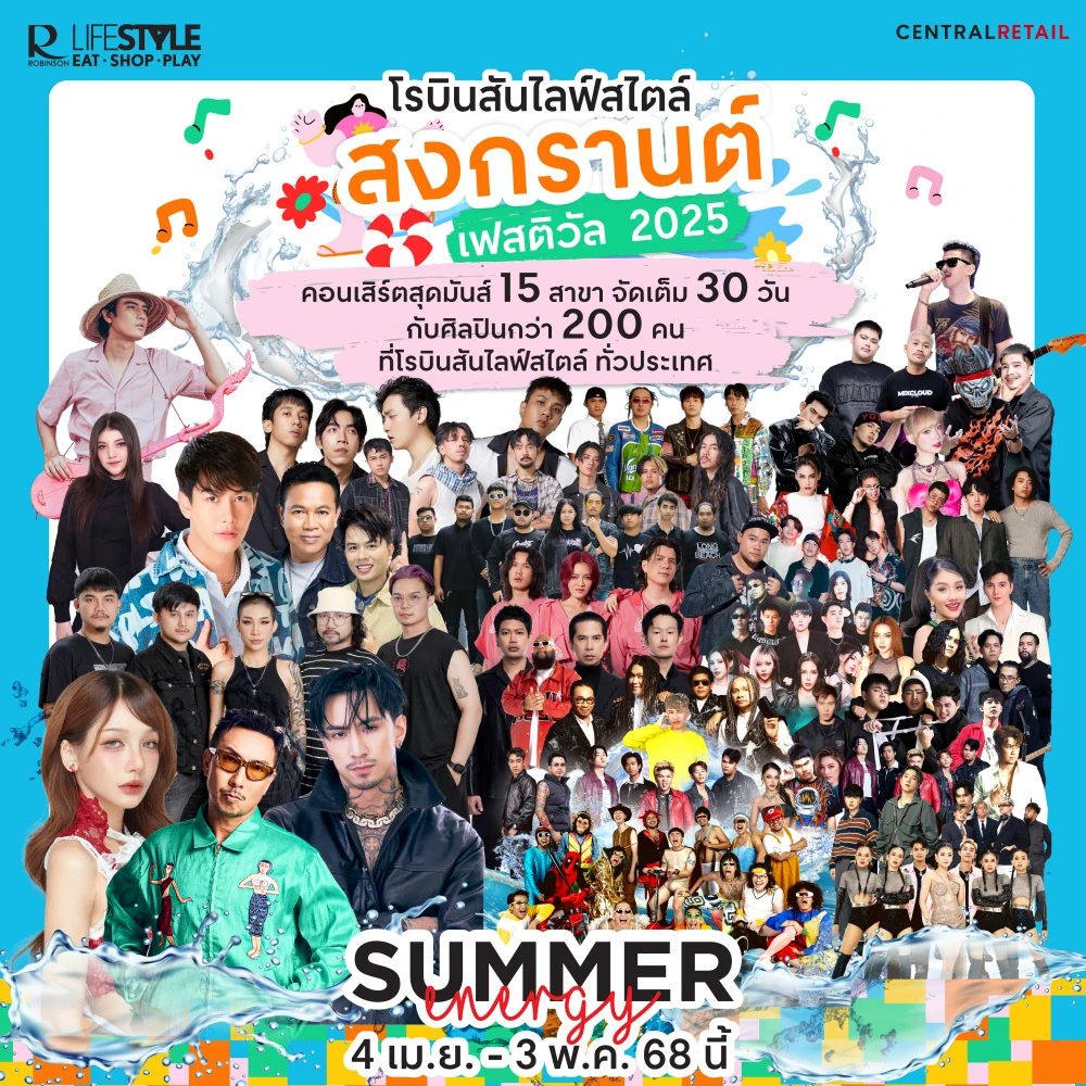 ศูนย์การค้าโรบินสันไลฟ์สไตล์ ในเครือเซ็นทรัล รีเทล พร้อมปลุกพลังความสนุกทั่วไทยต้อนรับเทศกาลสงกรานต์ สุดฟินจัดเต็มความบันเทิงกับงานสงกรานต์ เฟสติวัล 2025 Summer Energy Concert สุดมันส์กว่า 15 สาขา จัดเต็ม 30 วัน กับศิลปินชื่อดังกว่า 200 คน จัดเต็มกว่า ที่จะมาระเบิดความมันส์แบบเปียกสุดขั้ว และชุ่มฉ่ำทุกอณู ตั้งแต่วัน 4 เม.ย. 68 – 3 พ.ค. 68 ณ โรบินสันไลฟ์สไตล์ ทั่วประเทศ