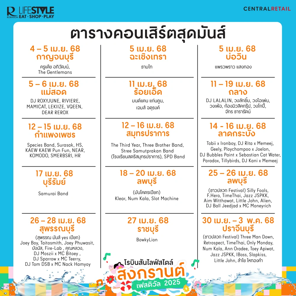 โรบินสันไลฟ์สไตล์ สาดความมันส์ ชุ่มฉ่ำสงกรานต์ทั่วไทย กับ งานสงกรานต์ เฟสติวัล 2025 Summer Energy Concert สุดมันส์ 15 สาขา จัดเต็ม 30 วัน กับศิลปินกว่า 200 คน ณ โรบินสันไลฟ์สไตล์ ทั่วประเทศ