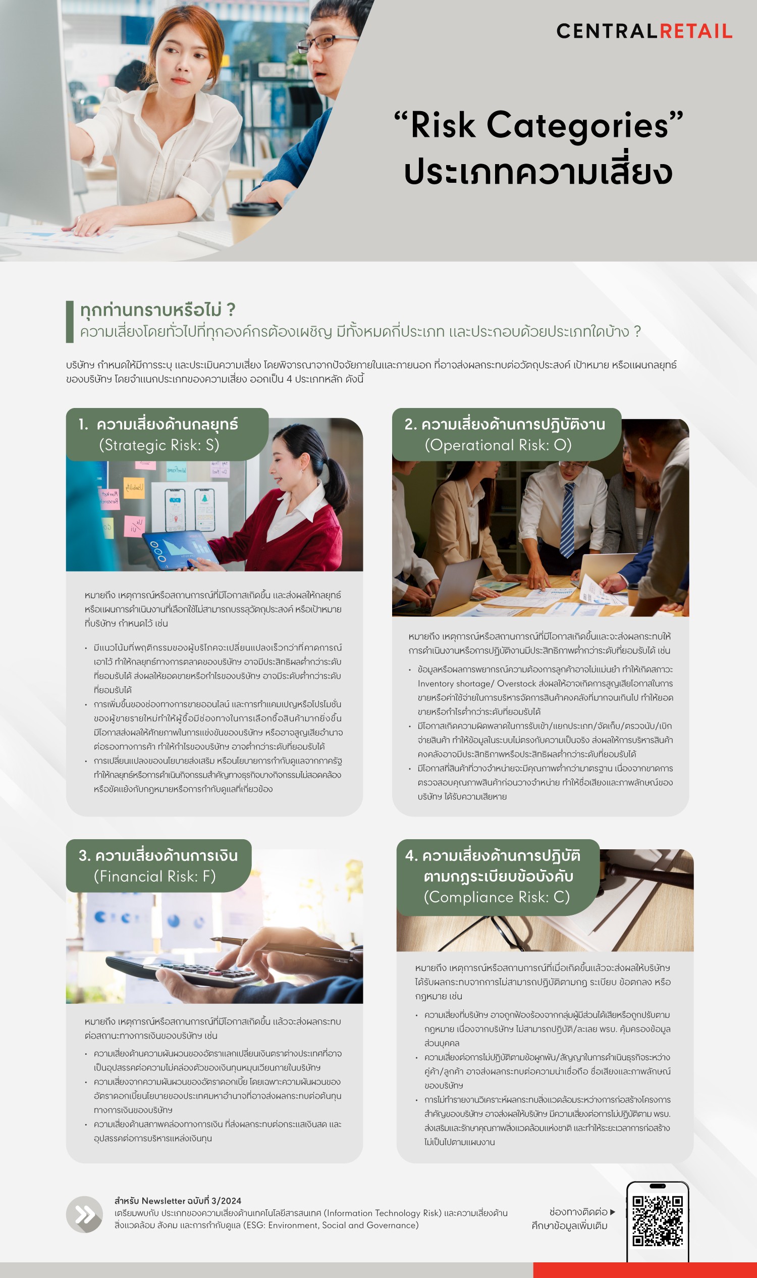 - Employee level: Central Retail provides the CRC-Risk Management and GRC E-Learning Course in an online format, making it accessible for employees at all levels to study and learn at their convenience. This comprehensive course covers a wide range of topics, starting from the fundamentals of risk management, good governance, and compliance to the principles of integrated GRC (Governance, Risk, and Compliance) management. The program is designed to enhance awareness, deepen knowledge in risk management, and instill the principles of integrated GRC management among all employees.