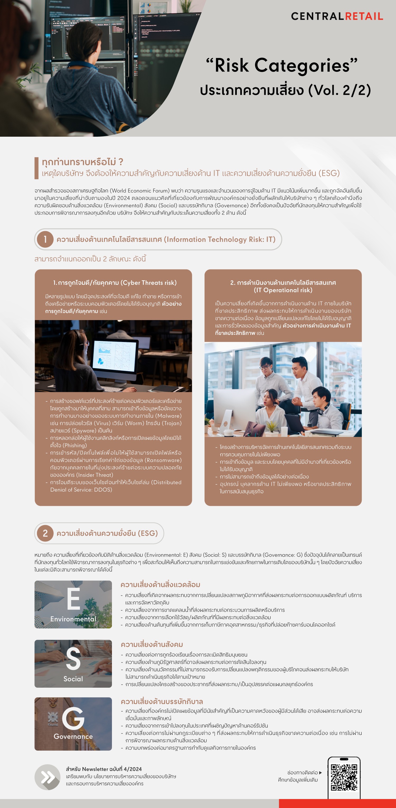Leading up to the end of 2023, the risk management team conducted a thorough analysis of significant risk profiles, utilizing Central Retail's vision, mission, values, and objectives as central pillars in their risk assessment process. In addition, they considered various internal and external factors, business context, economic trends, political climate, societal influences, technological advancements, environmental considerations, legal regulations, as well as insights from reputable international organizations such as the World Economic Forum, CRO Forum, and Internal Audit Foundation. Furthermore, risk data from business units was utilized to create a preliminary framework for risk appetite, risk tolerance, risk indicators, and risk assessment criteria. This framework considered statistical data on events and operational outcomes that have had a direct impact on Central Retail and similar businesses. Following this, a summary of the data was updated to senior management through surveys to identify key risks, levels of risk severity, risk appetite, risk tolerance, Key Risk Indicators (KRI), and risk assessment criteria for approval by CRC RMC and RPC. Subsequently, Risk Owners were assigned to oversee and manage risks within their respective departments. Risk exposures are then assessed based on the impact and likelihood criteria as shown in the risk matrix. Risk exposures is regularly reviewed and updated at least twice a year to ensure risks are well managed throughout the organization. The risks are categorized into seven groups: Strategic Risk, Operational Risk, Financial Risk, Compliance Risk, IT Risk, ESG Risk, and Black Swan Risk.