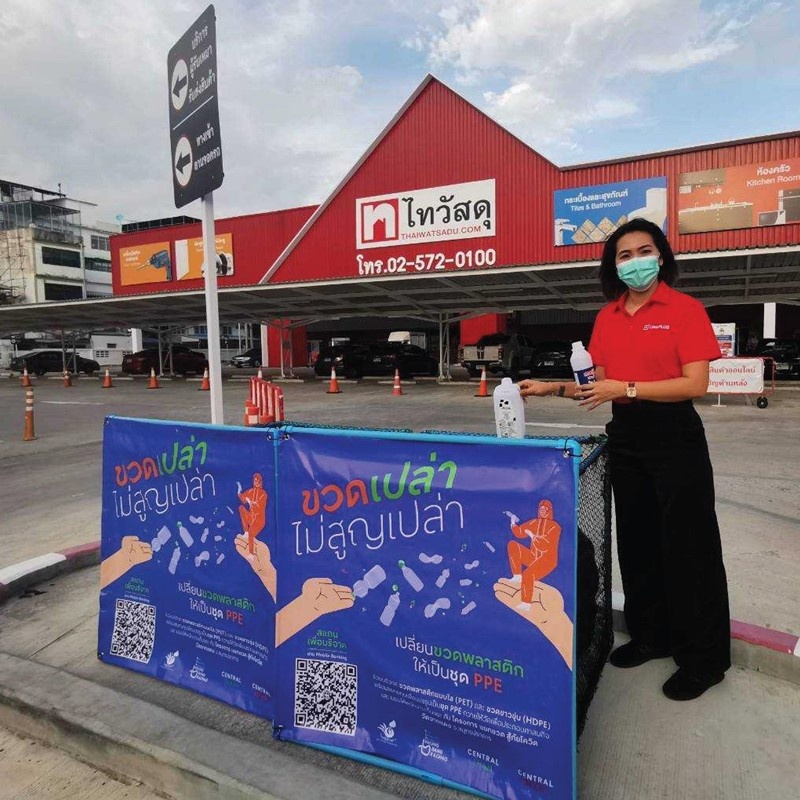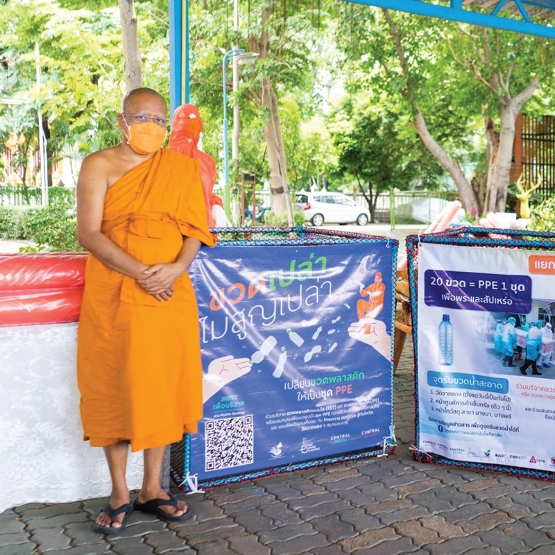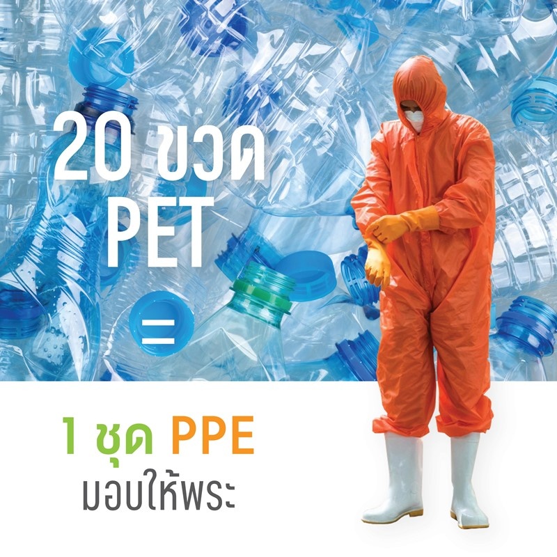 With the campaign "PET to PPE" Central Retail invites you to collect plastic bottles and make a donation for transforming throwaway bottles into PPE kits, increasing awareness of the severity of the ongoing COVID-19 situation. Which affected the safety of people in all regions, also including those on the front lines, such as medical staff, the general public, and even a monk all need protections from the virus.