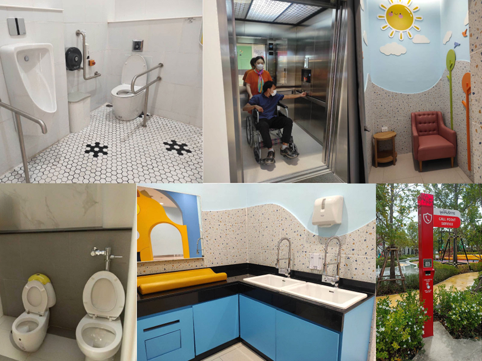 The Company is committed to promoting and respecting human rights by embracing diversity and ensuring no one is left behind. To provide equitable and accessible spaces for persons with disabilities, elderly individuals, and other vulnerable groups, the company has implemented designs and construction in line with the principles of Universal Design. This approach ensures inclusivity and accessibility for all, including parents with young children, making it easy for everyone to access and enjoy the center without barriers. As a result, our centers are among the top choices for users, enhancing the brands and the organization’s image. The facilities include: