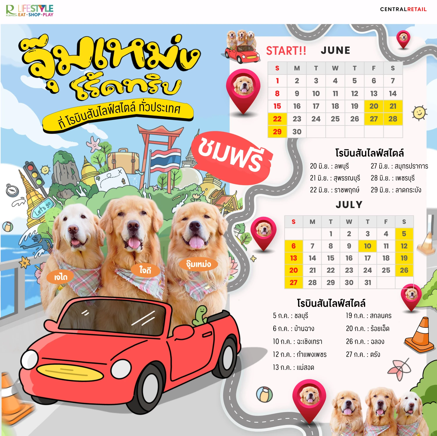 ศูนย์การค้าโรบินสันไลฟ์สไตล์ ในเครือเซ็นทรัล รีเทล ชวนแฟนคลับสายขนฟูร่วมสร้างโมเมนต์สุดอบอุ่นใจผ่านกิจกรรม “จุ๊มเหม่ง โร้ดทริป” การเดินทางครั้งพิเศษของน้องหมาโกลเด้นรีทรีฟเวอร์ชื่อดัง “จุ๊มเหม่ง” พร้อมผองเพื่อน “เจได” และ “ใจดี” ที่จะพาแฟน ๆ ไปพบกับความน่ารัก ขี้เล่น และความสุขแบบใกล้ชิดตลอดเส้นทางทั่วประเทศ มาพร้อมกิจกรรม Meet & Greet สุดเอ็กซ์คลูซีฟให้ทุกคนได้ถ่ายภาพร่วมกับน้องๆ พร้อมสนุกกับกิจกรรมบนเวทีสุดครึกครื้น เพื่อช่วยจุดกระแสการท่องเที่ยวไทย กระตุ้นเศรษฐกิจและสร้างสีสันให้กับแต่ละจังหวัดที่จัดกิจกรรม ตลอดเส้นทาง ตั้งแต่วันที่ 20 มิ.ย. 68 – 27 ก.ค. 68 ที่ศูนย์การค้าโรบินสันไลฟ์สไตล์ 15 สาขาทั่วประเทศ ชมฟรีตลอดงาน!