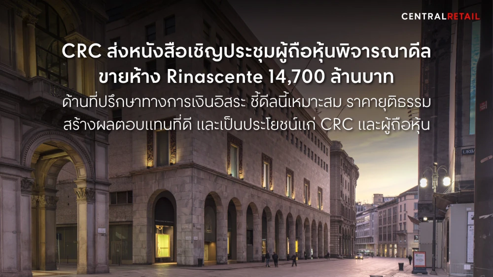 CRC ส่งหนังสือเชิญประชุมผู้ถือหุ้นพิจารณาดีลขายห้าง Rinascente 14,700 ล้านบาท ด้านที่ปรึกษาทางการเงินอิสระ ชี้ดีลนี้เหมาะสม ราคายุติธรรม สร้างผลตอบแทนที่ดีและเป็นประโยชน์แก่ CRC และผู้ถือหุ้น