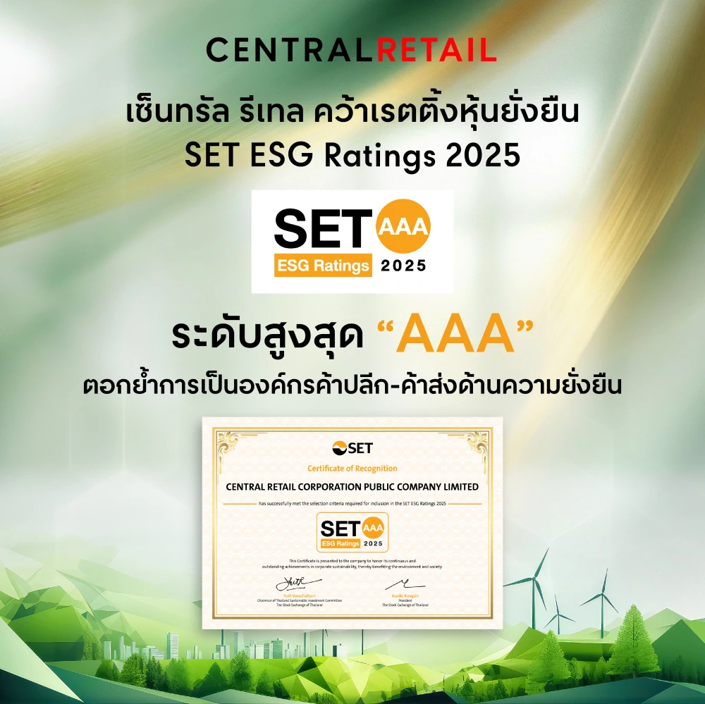 การที่เซ็นทรัล รีเทล ได้รับผลประเมินหุ้นยั่งยืน SET ESG Ratings ประจำปี 2025 ที่ระดับ ‘AAA’ และได้รับการคัดเลือกเป็นหุ้นยั่งยืนต่อเนื่องเป็นปีที่ 5 ติดต่อกัน จากตลาดหลักทรัพย์แห่งประเทศไทย สะท้อนให้เห็นถึงการเป็นบริษัทจดทะเบียนที่ดำเนินธุรกิจเพื่อความยั่งยืนอย่างโดดเด่น และให้ความสำคัญกับสิ่งแวดล้อม สังคม และบรรษัทภิบาล (Environmental, Social and Governance: ESG) พร้อมคำนึงถึงผู้มีส่วนได้เสียทุกฝ่ายอย่างทั่วถึงรอบด้าน และมีส่วนร่วมสร้างผลกระทบเชิงบวกในวงกว้าง โดยเซ็นทรัล รีเทล พร้อมเดินหน้าพัฒนาธุรกิจบนกรอบความยั่งยืน ควบคู่ไปกับการขับเคลื่อนเศรษฐกิจ และยกระดับคุณภาพชีวิตของคนไทยให้ดีขึ้นต่อไป