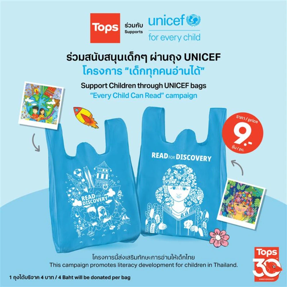 กรุงเทพฯ 12 มกราคม 2569 – ท็อปส์ ธุรกิจกลุ่มฟู้ด ในเครือเซ็นทรัล รีเทล เดินหน้าสร้างคุณค่าร่วมกับสังคม ผ่านความร่วมมือกับองค์การยูนิเซฟ ประเทศไทย เปิดตัวถุงช้อปปิ้งท็อปส์ รุ่นลิมิตเต็ดเอดิชัน “Read for Discovery” ราคา 9 บาท เชิญชวนลูกค้าร่วมสนับสนุนการพัฒนาทักษะการอ่าน และการเรียนรู้ของเด็กๆ ในประเทศไทยอย่างทั่วถึง โดยรายได้ส่วนหนึ่งจากการจำหน่ายถุงช้อปปิ้งดังกล่าวจะนำไปสมทบทุนโครงการ “Every Child Can Read” ขององค์การยูนิเซฟ ประเทศไทย เพื่อส่งเสริมโอกาสทางการเรียนรู้ของเด็กไทยอย่างครอบคลุม ความร่วมมือในครั้งนี้เป็นส่วนหนึ่งของกิจกรรมเพื่อสังคมในโอกาสครบรอบ 30 ปีของท็อปส์ ที่มุ่งดำเนินธุรกิจควบคู่กับการสร้างคุณค่าคืนสู่สังคมอย่างต่อเนื่อง ถุงช้อปปิ้งรุ่นพิเศษนี้ ถ่ายทอดผลงานศิลปะของเด็กนักเรียนผู้ได้รับรางวัลจากกิจกรรมประกวดวาดภาพในหัวข้อ “Read for Discovery” (อ่านเพื่อเรียนรู้โลกกว้าง) ภายใต้โครงการ A Book A Week ร่วมกับ องค์การยูนิเซฟ ประเทศไทย และ กระทรวงศึกษาธิการ สู่การใช้งานจริงในชีวิตประจำวัน รวมถึงเป็นสัญลักษณ์ของการส่งต่อแรงบันดาลใจจากการอ่านสู่สังคมในวงกว้าง สำหรับถุงช้อปปิ้ง TOPS รุ่นลิมิตเต็ดเอดิชันได้สะท้อนพลังความคิดสร้างสรรค์และสร้างความภาคภูมิใจให้แก่เยาวชนเจ้าของผลงาน พร้อมตอกย้ำว่าความคิดสร้างสรรค์เล็ก ๆ สามารถต่อยอดเป็นโอกาส และสร้างการเปลี่ยนแปลงเชิงบวกให้กับสังคมในภาพใหญ่ได้ โดยท็อปส์มุ่งเชื่อมโยงพลังของเด็ก เยาวชน และผู้บริโภค และเปลี่ยนประสบการณ์การช้อปปิ้งในชีวิตประจำวันของผู้บริโภคให้เป็น #EverydayDISCOVERY ที่ลูกค้าสามารถมีส่วนร่วมสร้างผลลัพธ์เชิงบวกให้กับสังคม ภายใต้แนวคิด “Small Acts Together” และพันธกิจ ‘12 Missions to Sustainable Retail’ ร่วมเป็นส่วนหนึ่งในการส่งเสริมการอ่านให้เด็กๆ ได้ผ่านถุงช้อปปิ้งท็อปส์รุ่นลิมิตเต็ดเอดิชันสุดเอ็กซ์คลูซีฟที่ถ่ายทอดจินตนาการและแรงบันดาลใจของเด็ก ตั้งแต่วันนี้เป็นต้นไป ที่ท็อปส์ และท็อปส์ ฟู้ด ฮอลล์ ทุกสาขา ติดตามรายละเอียดเพิ่มเติมได้ที่ www.tops.co.th, เฟซบุ๊ก TOPS Thailand หรือแอปพลิเคชันไลน์ @TOPSThailand