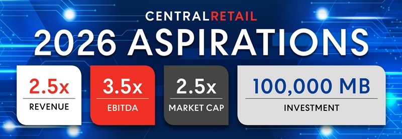 เซ็นทรัล รีเทล ตั้งเป้าผลประกอบการในปี 2569 เราจะเติบโตในทุกมิติ ด้านรายได้เติบโต 2.5 เท่า EBITDA เพิ่มขึ้น 3.5 เท่า และ Market Cap เพิ่มขึ้น 2.5 เท่า ด้วยงบลงทุน 100,000 ล้านบาท ด้วยรากฐานทางธุรกิจที่แข็งแกร่งของ Next-Gen Omni Retail ผนวกกับ CRC Data Ecosystem