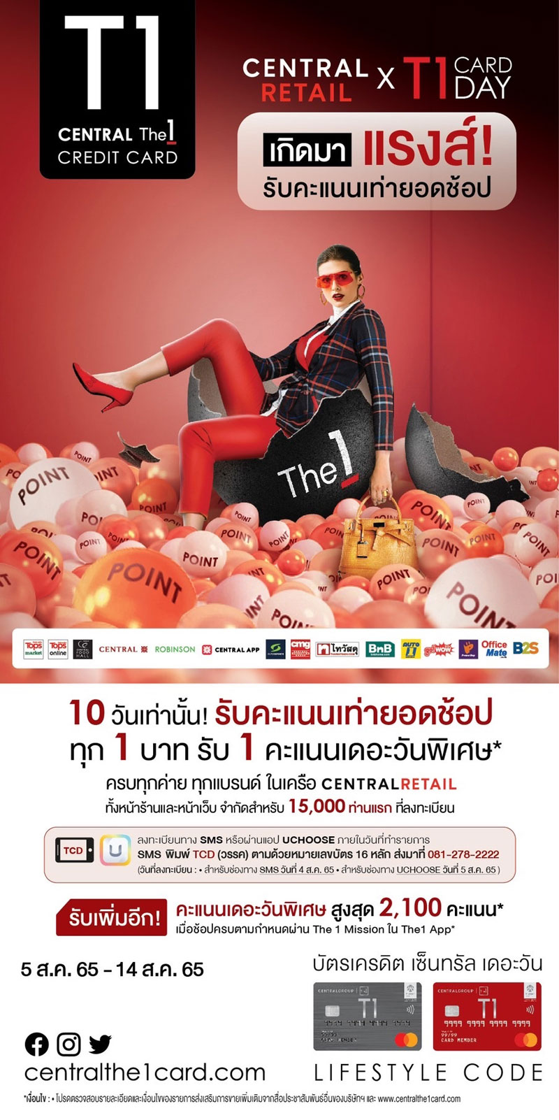 โปรแรงแห่งปี “Central Retail X T1 Card Day” เอาใจนักช้อปมอบสิทธิพิเศษ 3 ต่อ สำหรับสมาชิกบัตรเครดิต เซ็นทรัล เดอะวัน ระหว่างวันที่ 5 - 14 สิงหาคม 2565 ที่ท็อปส์, เซ็นทรัล ฟู้ด ฮอลล์, ท็อปส์ ออนไลน์, ห้างสรรพสินค้าเซ็นทรัล, โรบินสัน, เซ็นทรัล แอป, ซูเปอร์สปอร์ตและร้านค้าในเครือ CRC Sports, ร้านค้าในเครือ CMG, ไทวัสดุ, บีเอ็นบี โฮม, ออโต้วัน, โก! ว้าว, เพาเวอร์บาย, ออฟฟิศเมท, บีทูเอส (รวมการซื้อผ่านช่องทางออนไลน์) ต่อที่ 1 รับคะแนนเดอะวันพิเศษเท่ายอดช้อป ทุก 1 บาท รับ 1 คะแนนเดอะวันพิเศษ (จำนวนจำกัดสำหรับ 15,000 ท่านแรกที่ลงทะเบียนผ่านแอป UCHOOSE หรือ SMS) ต่อที่ 2 รับเพิ่มคะแนนเดอะวันพิเศษสูงสุด 2,100 คะแนน สำหรับลูกค้าที่มีแอป The1 และช้อปครบตามกำหนดและกดรับสิทธิ์บน The 1 Mission (เฉพาะการทำรายการที่สาขา ยกเว้นช่องทางออนไลน์) และต่อที่ 3 รับคะแนนเดอะวันสูงสุด 4 เท่า (เงื่อนไขเป็นไปตามที่กำหนด) ข้อมูลเพิ่มเติม www.centralthe1card.com