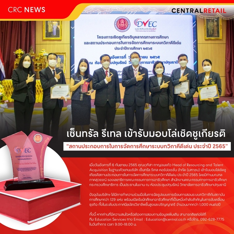 เมื่อวันอังคารที่ 6 กันยายน 2565 คุณเวทิสา กาญจนแก้ว Head of Resourcing and Talent Acquisition ในฐานะตัวแทนบริษัท เซ็นทรัล รีเทล คอร์ปอเรชั่น จำกัด (มหาชน) เข้ารับมอบโล่เชิดชูเกียรติสถานประกอบการในการจัดการศึกษาระบบทวิภาคีดีเด่น ประจำปี 2565 โดยมีท่านมณฑล ภาคสุวรรณ์ รองเลขาธิการคณะกรรมการการอาชีวศึกษา สำนักงานคณะกรรมการการอาชีวศึกษา กระทรวงศึกษาธิการ เป็นประธานในงาน ณ ห้องประชุมปทุมรัตน์ วิทยาลัยการอาชีวศึกษาปทุมธานี