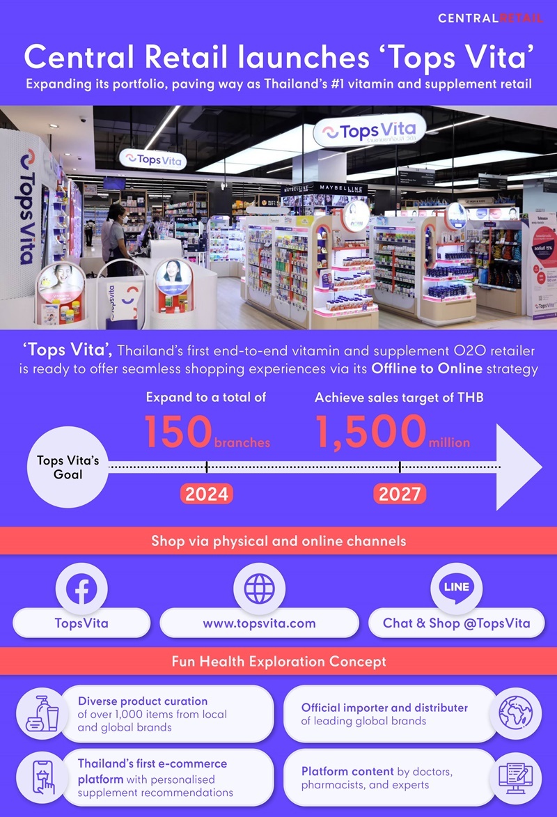 เซ็นทรัล รีเทล ปูพรมธุรกิจใหม่ เปิดตัว ท็อปส์วีต้า ร้านจำหน่ายวิตามินแบบ O2O เจ้าแรกในไทย เร่งขยาย 150 สาขาทั่วประเทศ พร้อมตั้งเป้ายอดขายทะลุ 1,500 ล้านบาท ในปี 2570 ขึ้นเบอร์ 1 ตลาดวิตามินและอาหารเสริมของไทย