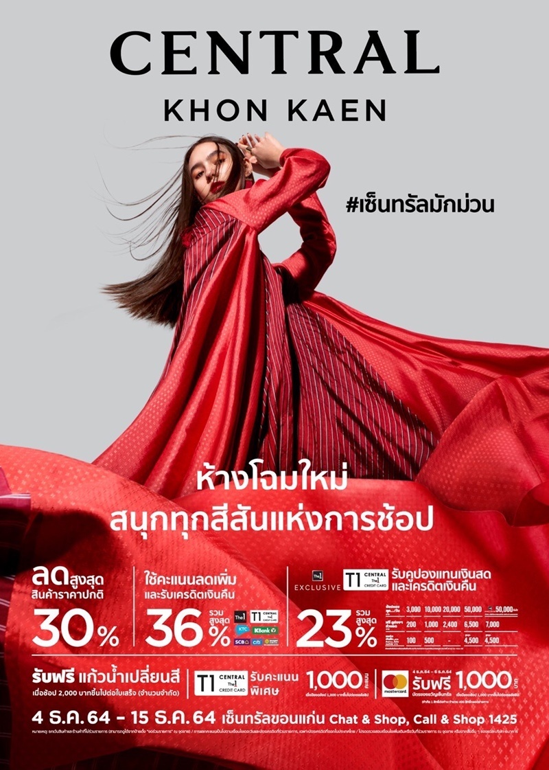 พิเศษ! ฉลองเปิดห้างเซ็นทรัลขอนแก่นอย่างยิ่งใหญ่ จัดเต็ม! สิทธิพิเศษมากมายต้อนรับลูกค้ากับโปรโมชั่นสุดว้าว “Grand Opening Central Khon Kaen” ตั้งแต่ 4-15 ธ.ค.64 ดังนี้ สินค้าราคาปกติลดสูงสุด 30%, ใช้คะแนนลดเพิ่มและรับเครดิตเงินคืนรวมสูงสุด 36% จากเดอะวันและบัตรเครดิตที่ร่วมรายการ รับฟรี! คูปองแทนเงินสด และเครดิตเงินคืนจากบัตรเครดิตเซ็นทรัล เดอะวัน รวมสูงสุด 23% เมื่อช้อปครบตามเงื่อนไข และรับของ Premium สุดพิเศษ แก้วน้ำเปลี่ยนสี เมื่อช้อป 2,000 บาท ขึ้นไปต่อใบเสร็จ (จำนวนจำกัด) และวันที่ 4-15 ธ.ค.64 ช้อปผ่านบัตรเครดิตเซ็นทรัล เดอะวัน รับคะแนนเดอะวันพิเศษเพิ่ม 1,000 คะแนน หรือ ช้อปผ่านบัตรเครดิตทีทีบี รับกระเป๋า VISA Olympic Bag เมื่อช้อปสะสม 2,000 บาทขึ้นไปต่อวัน พร้อมสิทธิพิเศษจากบัตรเครดิตชั้นนำ ที่ร่วมรายการอีกมากมาย
