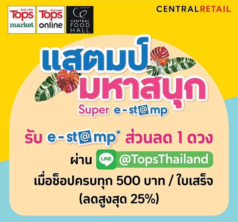- แสตมป์มหาสนุก ช้อปสะสม e-stamp ผ่าน Line@TopsThailand ปลดล็อคคูปองส่วนลดสูงสุด 25% และ e-Voucher สูงสุด 950 บาท รับง่าย ๆ เมื่อซื้อสินค้าครบทุก 500 บาท ตั้งแต่วันนี้ – 26 เมษายน 2565 ที่ท็อปส์ มาร์เก็ต, ท็อปส์ ซูเปอร์ สโตร์, ท็อปส์ ออนไลน์และเซ็นทรัล ฟู้ด ฮอลล์ ทุกสาขา พิเศษมากขึ้นอีกขั้น! รับ E-Voucher มูลค่า 650 บาท เมื่อซื้อสินค้าผ่านบริการผู้ช่วยช้อปส่วนตัว (Personal Shopper)