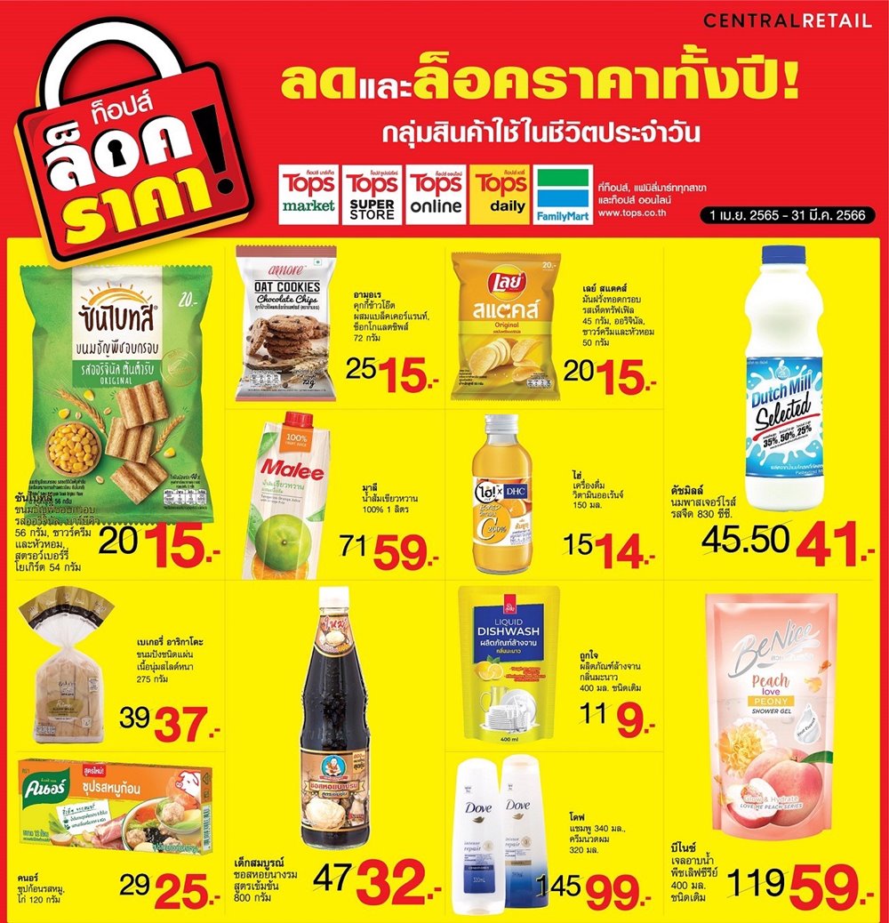 กรุงเทพฯ 5 เมษายน 2565 – ยืนหนึ่งเคียงข้างคนไทย ท็อปส์ และ แฟมิลี่มาร์ท ในเครือเซ็นทรัล รีเทล ผนึกผู้ผลิตสินค้ากว่า 58 แบรนด์ดัง สร้างปรากฎการณ์ครั้งยิ่งใหญ่ เปิดตัวมาตรการช่วยคนไทย เซฟค่าใช้จ่าย ประกาศจัด “ท็อปส์ ล็อคราคา!” ลดและล็อคราคาสินค้าอุปโภค-บริโภค ที่จำเป็น ในชีวิตประจำวัน 190 รายการ มั่นใจดีลราคาดีที่สุด ไม่เปลี่ยนตัวสินค้า ลดและล็อค ยืนราคาเดิมยาวนาน 1 ปี ตั้งแต่วันที่ 1 เมษายน 2565 – 31 มีนาคม 2566 ที่ท็อปส์ มาร์เก็ต, ท็อปส์ ซูเปอร์สโตร์, ท็อปส์ เดลี่, ท็อปส์ ออนไลน์ และ แฟมิลี่มาร์ททุกสาขา ตอกย้ำความคุ้มค่า คุ้มราคา ทุกการจับจ่าย หวังให้คนไทยทุกคนได้ก้าวผ่านทุกวิกฤตไปด้วยกัน