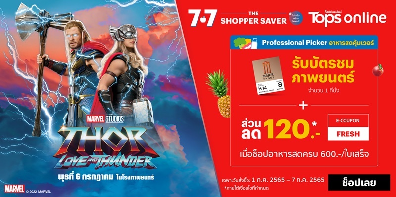 เพื่อฉลองเปิดตัว “Professional Picker” ผู้ช่วยช้อปอาหารสดมือโปร เพียงสั่งซื้ออาหารสดผ่านท็อปส์ ออนไลน์ ในวันที่ 1 -7 กรกฎาคม 2565 ครบ 600 บาทขึ้นไป / ใบเสร็จ ต้อนรับการกลับมาอย่างยิ่งใหญ่กับเทพเจ้าแห่งสายฟ้าในภาพยนตร์ภาคต่อฟอร์มยักษ์ รับฟรี! บัตรชมภาพยนตร์ “Marvel Studios' Thor: Love and Thunder ธอร์: ด้วยรักและอัสนี” จำนวน 1 ที่นั่ง และคูปองส่วนลดอีก 120 บาท