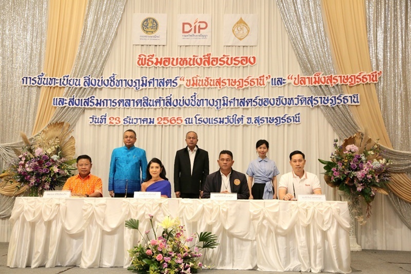 นายสินิตย์ เลิศไกร รัฐมนตรีช่วยว่าการกระทรวงพาณิชย์ พร้อมด้วย นางสาวกนิษฐา กังสวนิช รองอธิบดีกรมทรัพย์สินทางปัญญา และนายชัยรัตน์ เพชรดากูล ผู้ช่วยกรรมการผู้จัดการฝ่ายจัดซื้อ สินค้าอาหารสด บริษัท เซ็นทรัล ฟู้ด รีเทล จำกัด ในเครือเซ็นทรัล รีเทล ลงพื้นที่จังหวัดสุราษฎร์ธานี เดินหน้ายกระดับสินค้าชุมชน เซ็นสัญญาซื้อ-ขายล่วงหน้าสินค้า GI “เงาะโรงเรียนนาสาร” กับสหกรณ์การเกษตรบ้านนาสาร กว่า 100 ตัน เตรียมนำจำหน่ายที่ ท็อปส์, ท็อปส์ ฟู้ด ฮอลล์, ท็อปส์ ไฟน์ ฟู้ด และ ตลาดจริงใจ Farmers’ Market ทั่วประเทศ พร้อมลงนามความร่วมมือสนับสนุนพื้นที่สำหรับจำหน่ายสินค้าปลาเม็งสุราษฎร์ธานีกับวิสาหกิจชุมชนแปลงใหญ่ เพื่อยกระดับอาหารพื้นบ้านสะท้อนอัตลักษณ์ท้องถิ่น โดยมี นายวิชวุทย์ จินโต ผู้ว่าราชการจังหวัดสุราษฎร์ธานี ร่วมงาน พร้อมทั้งเยี่ยมชมการดำเนินงานและพูดคุยกับพี่น้องเกษตรกรที่นำสินค้ามาจำหน่ายที่ตลาดจริงใจ Farmers’ Market สุราษฎร์ธานี