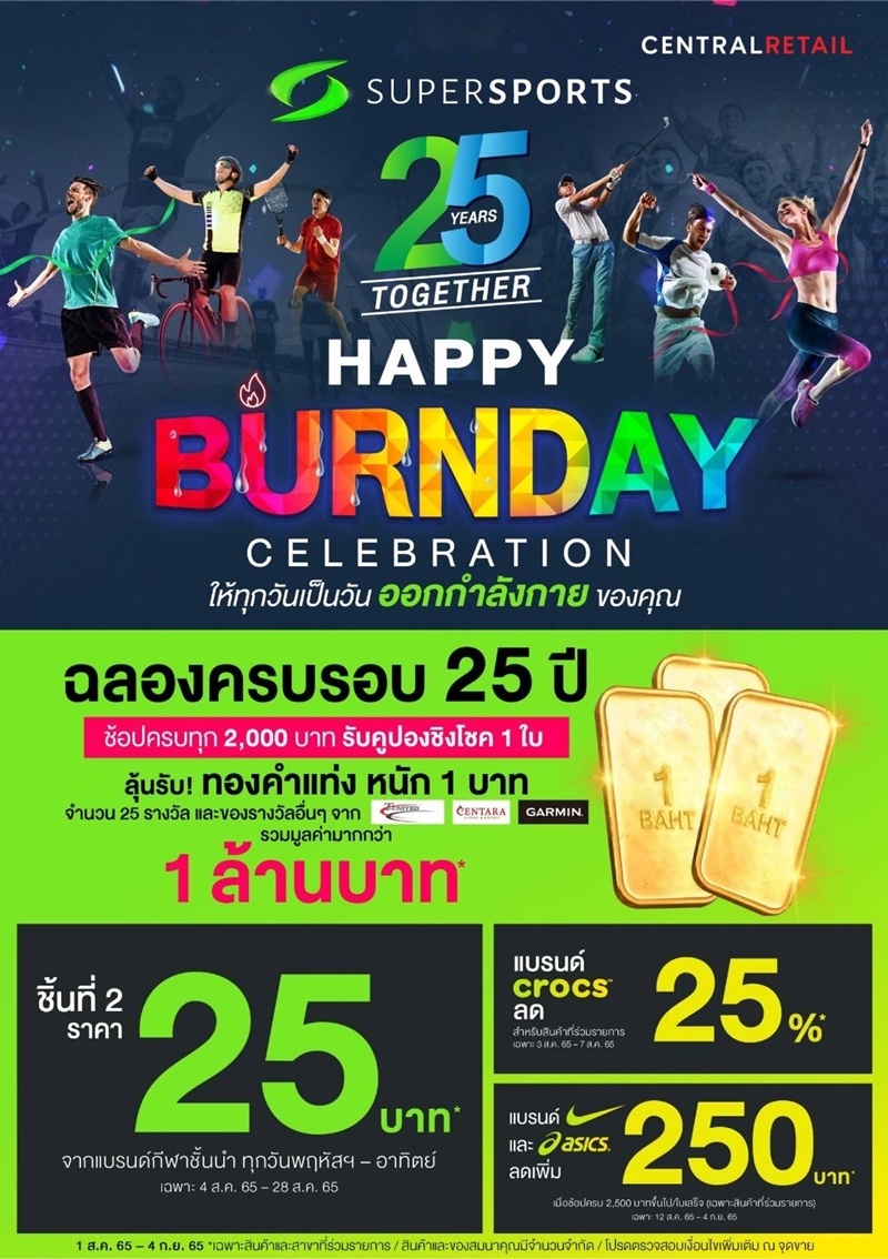 กรุงเทพฯ - 1 สิงหาคม 2564 - Supersports (ซูเปอร์สปอร์ต) ในเครือเซ็นทรัล รีเทล ร้านค้ากีฬาอันดับหนึ่งของประเทศไทย ฉลองครบรอบ 25 ปีอย่างยิ่งใหญ่ ส่งแคมเปญ “Happy Burnday Celebration ให้ทุกวัน เป็นวันออกกำลังกายของคุณ” ชวนคนไทยมาออกกำลังกายเป็นประจำ ให้ร่างกาย Stay Fit พิชิตทุกสถานการณ์ เพื่อสนับสนุนคนไทยให้ออกกำลังกายในทุกๆ วัน โดยซูเปอร์สปอร์ตมุ่งมั่นในการสร้างเสริมประสบการณ์ที่ดีที่สุด ด้วยการบริการที่ครบครัน ครอบคลุมทุกประเภทกีฬา ก้าวสู่การเป็นร้านค้ากีฬาอันดับหนึ่งของประเทศไทยในใจของคนไทยทุกคน ต่อๆ ไป