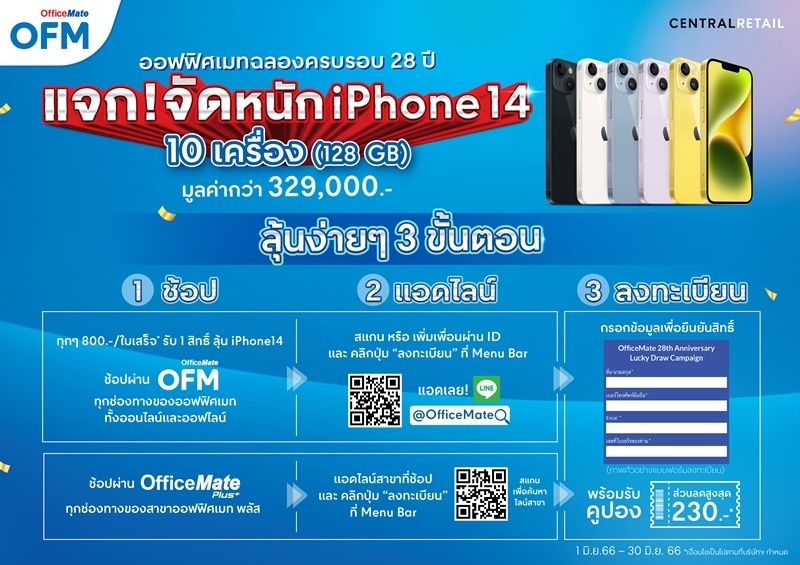 แจกจัดหนัก!...1 มิ.ย. 66 – 30 มิ.ย. 66 ช้อปสินค้าครบทุกๆ 800 บาท/ใบเสร็จ รับสิทธิ์ลุ้น iPhone 14 (128GB) จำนวน 10 เครื่อง มูลค่ารวม 329,000 บาท เพียงลงทะเบียนง่ายๆ ผ่าน Line: @OfficeMate และ Line สาขาออฟฟิศเมท พลัส พิเศษ!...หลังลงทะเบียนเสร็จรับทันทีคูปองส่วนลดสูงสุด 230 บาท สำหรับช้อปครั้งถัดไปได้เลย
