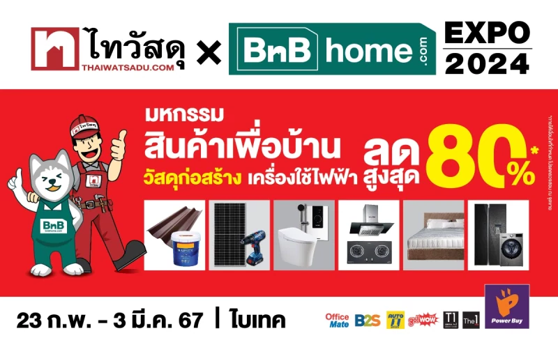 เตรียมตัวให้พร้อมแล้วมาช้อปกันที่งาน ‘ไทวัสดุ x บีเอ็นบี โฮม เอ็กซ์โป 2024’ ได้ตั้งแต่วันที่ 23 กุมภาพันธ์ - 3 มีนาคม 2567 เวลา 10.00 – 22.00 น. ณ ไบเทค บางนา ฮอลล์ 101 – 104 สามารถติดตามข้อมูลข่าวสาร และโปรโมชันเพิ่มเติมได้ที่ www.thaiwatsadu.com, Line : @Thaiwatsadu , Facebook: Thai Watsadu และ BnB home: www.bnbhome.com , Line : @bnbhometh , Facebook: BnB home
