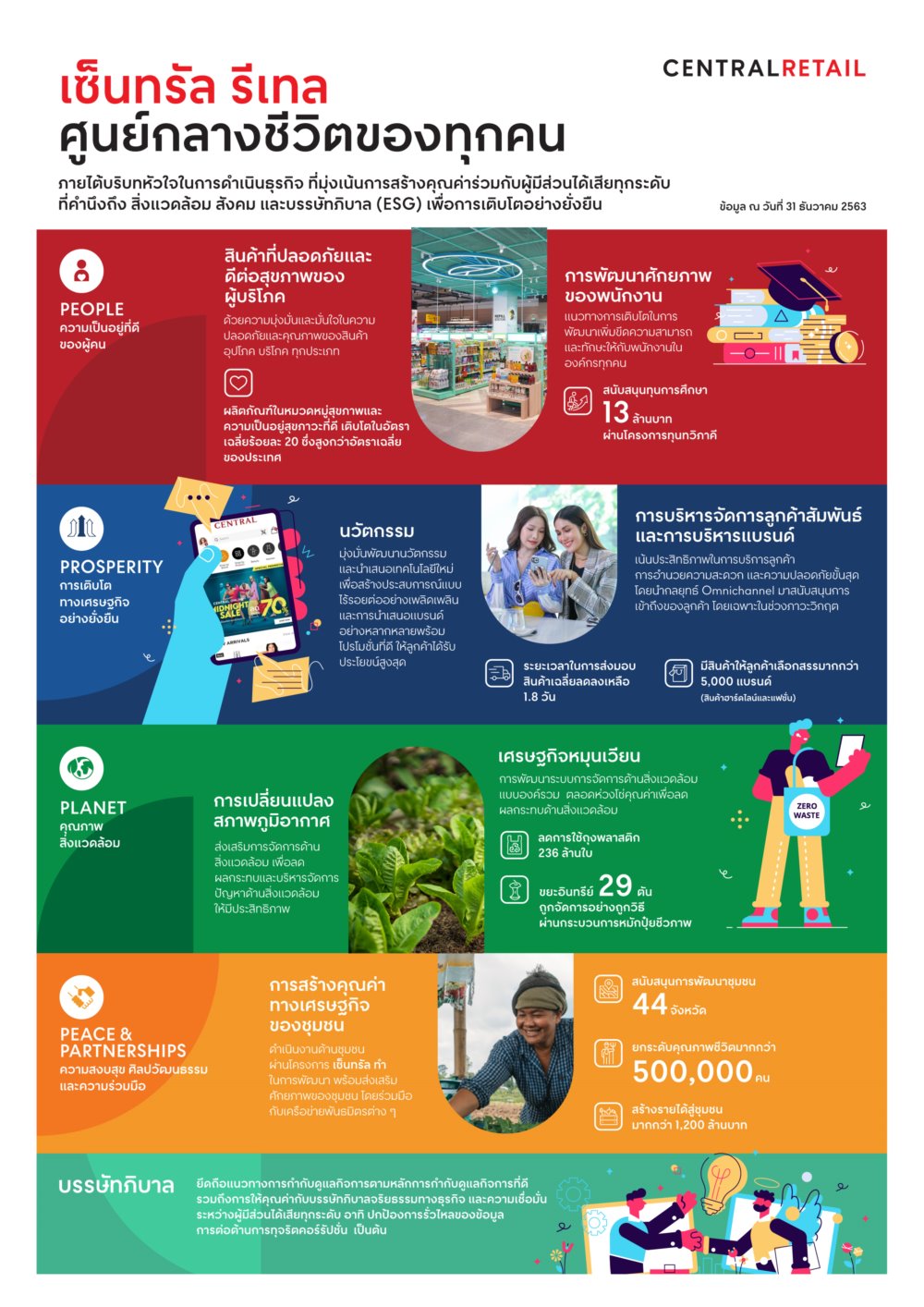 ทั้งนี้ในช่วงวิกฤตการณ์การแพร่ระบาดของโรคโควิด-19 ที่ผ่านมา เซ็นทรัล รีเทล ได้ให้การสนับสนุนด้านสาธารณสุข ควบคู่ไปกับการช่วยเหลือ และฟื้นฟูเศรษฐกิจ ให้ประเทศเดินหน้าต่อได้ อาทิ สนับสนุนการเป็นหน่วยร่วมบริการฉีดวัคซีนนอกโรงพยาบาล การส่งมอบอุปกรณ์ทางการแพทย์ อาหารและสิ่งของจำเป็น พร้อมทั้งดูแลชีวิตความเป็นอยู่ของพนักงาน ด้วยการจัดตั้ง ‘ศูนย์พักคอย โดยเซ็นทรัลทำ’ รวมไปถึงความร่วมมือและปฏิบัติตามมาตรการของกระทรวงสาธารณสุขอย่างเคร่งครัด ยึดถือในเรื่องความปลอดภัย และสุขอนามัยของพนักงาน และลูกค้าเป็นหัวใจสำคัญในการดำเนินงาน ไปจนถึงการรักษาการจ้างงานในภาคค้าปลีก และบริการที่มีมากกว่า 19 ล้านคนในระบบโดยไม่ทิ้งใครไว้ข้างหลัง ขณะเดียวกันก็มีการวางรากฐานการดำเนินธุรกิจให้มีประสิทธิภาพสูงสุด ตรวจสอบได้ และมีความโปร่งใส